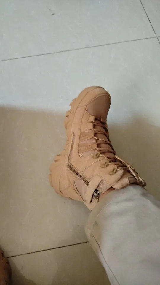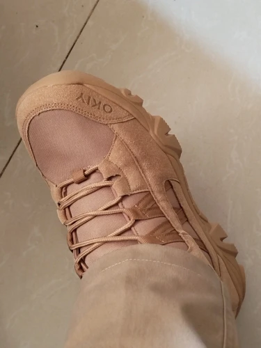 Ces bottes tactiques au design montant classique sont idéales pour la randonnée et les missions en extérieur. Leur couleur beige sable/désert assure une bonne intégration dans les environnements militaires. Elles offrent une silhouette robuste, un bon soutien de la cheville et un laçage renforcé par des œillets métalliques.